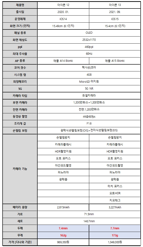 이번에 확인하면서 아이폰 12와 아이폰 13의