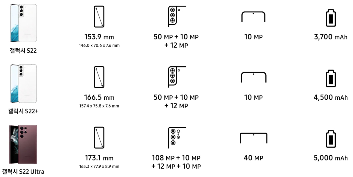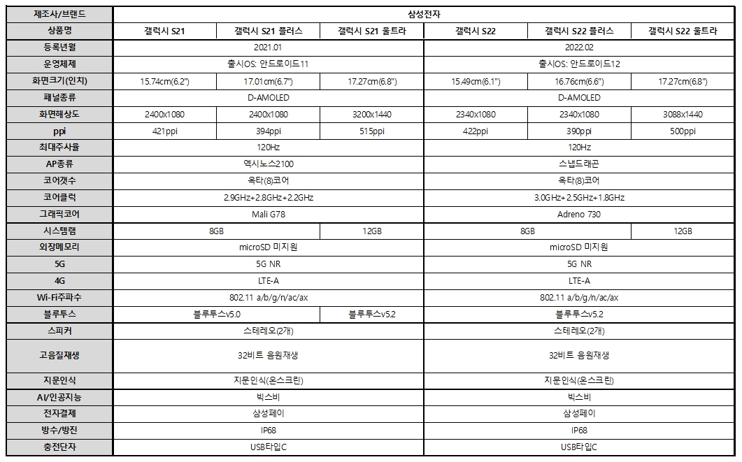 갤럭시 S22와 갤럭시 S22 PLUS경우 전작과 비슷하지만,