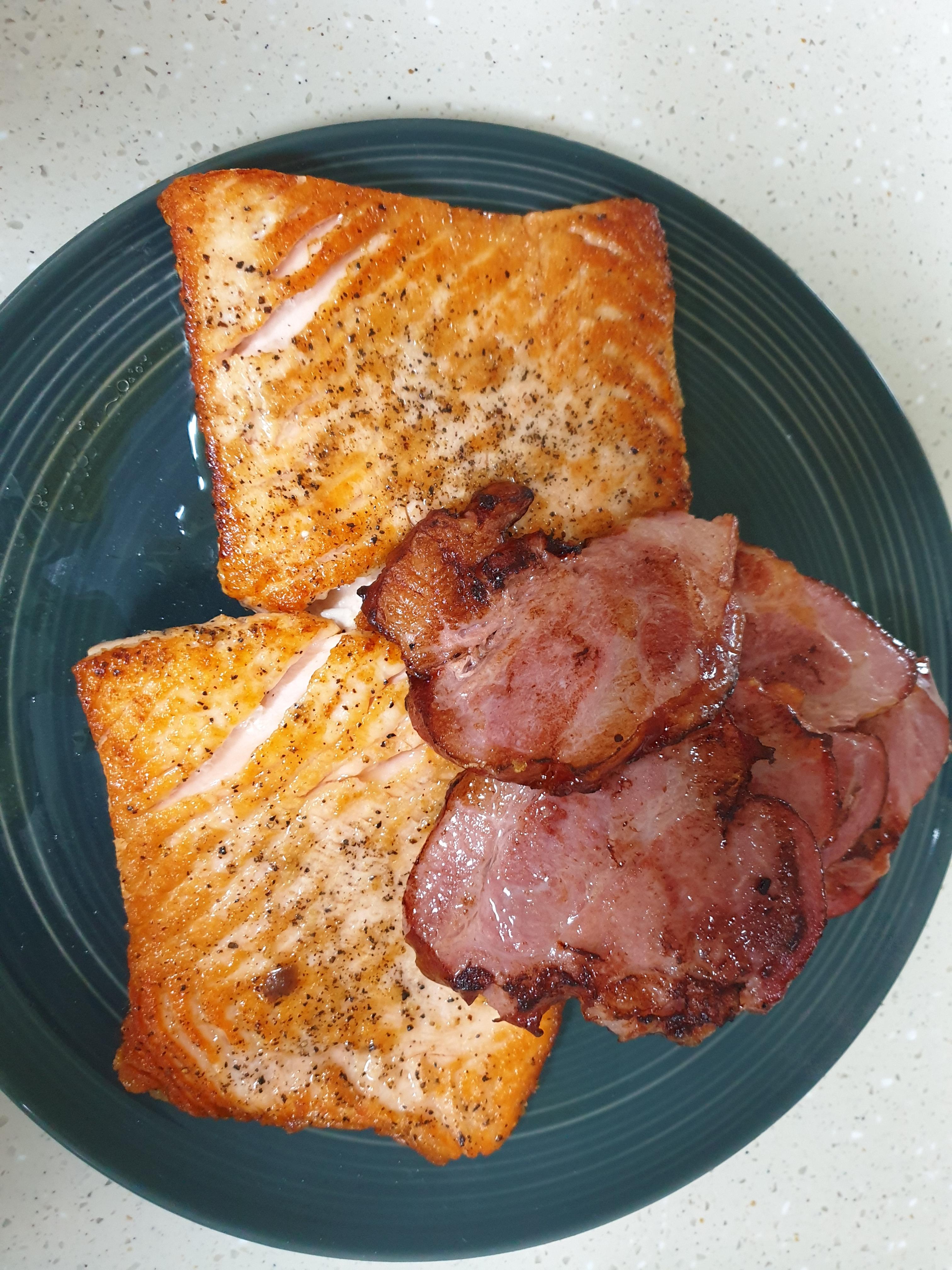 건강에도 좋고 맛도 좋은 연어랑 훈제 목살이다.