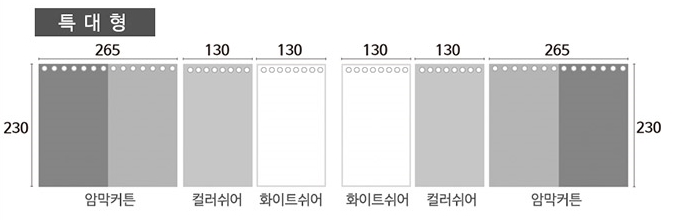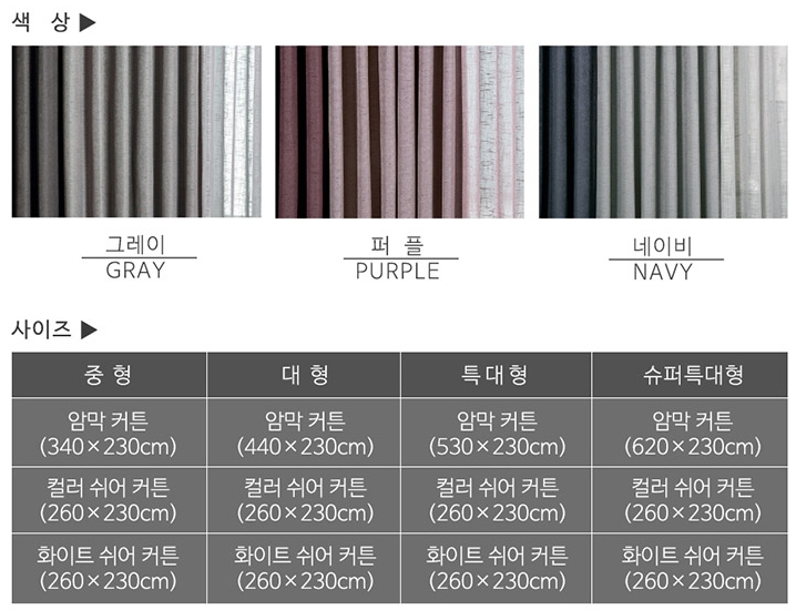 암막 커튼은 투톤이고, 컬러 쉬어 커튼, 화이트 쉬어 커튼으로 총 4가지 컬러로 구성 되어 있습니다.