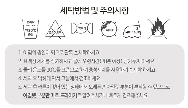 이 커튼은 손세탁을 하거나, 세탁기를 사용할시에는 단독세탁으로 약하게 해주시면 됩니다.