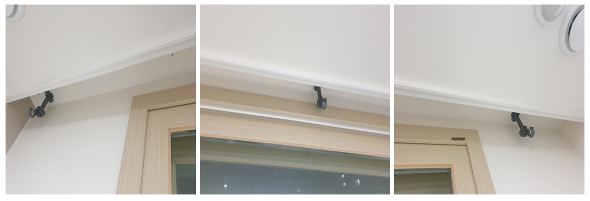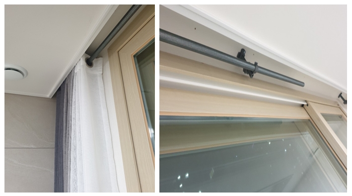 커튼봉이 3개가 약간 크고 중간 연결 커튼봉이 약간 작은데, 커튼봉 사이에 연결대를 연결해서 걸어줍니다.